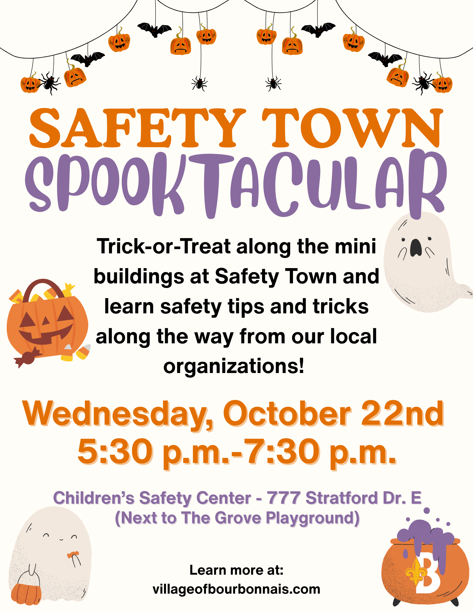 The Village of Bourbonnais, in partnership with the Kankakee County Combined Communication Center (KanComm), is thrilled to announce a free, family-friendly Safety Town Spooktacular event on Wednesday, October 22nd, from 5:30 p.m. to 7:30 p.m. at the Children’s Safety Center, located at 777 Stratford Drive East in Bourbonnais.